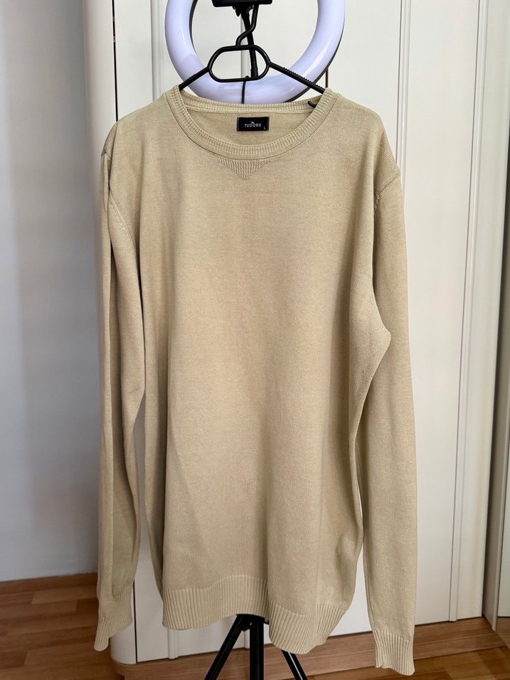 Bej renkte, keten kumaştan yapılmış, bisiklet yaka ve uzun kollu erkek kazak. Salaş kesimi ve minimal tasarımıyla günlük kullanıma uygundur.