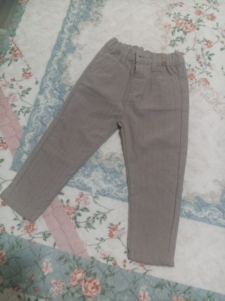 Bej keten kumaştan, düğmeli ve bol kesim erkek çocuk pantolonu. Normcore tarzında, desensiz ve rahat bir model.
