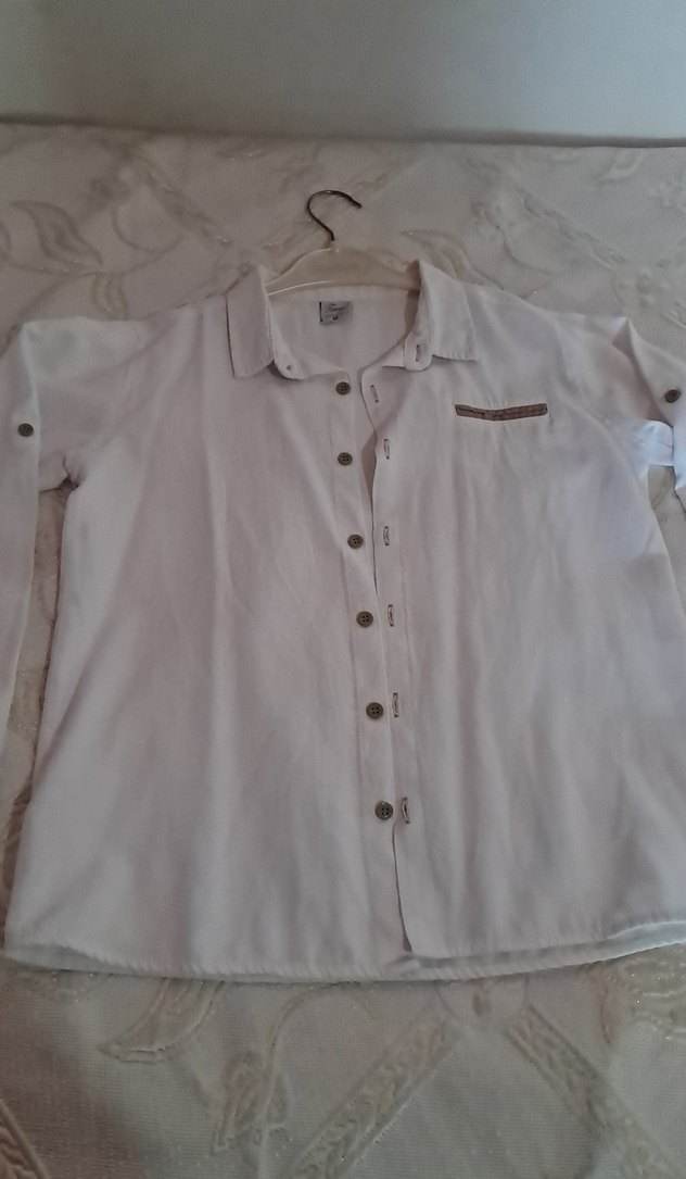 Bej renkli keten kumaştan, düğmeli ve yakalı, kısa kollu erkek çocuk gömleği. Salaş kesimiyle rahat bir tarz sunar.