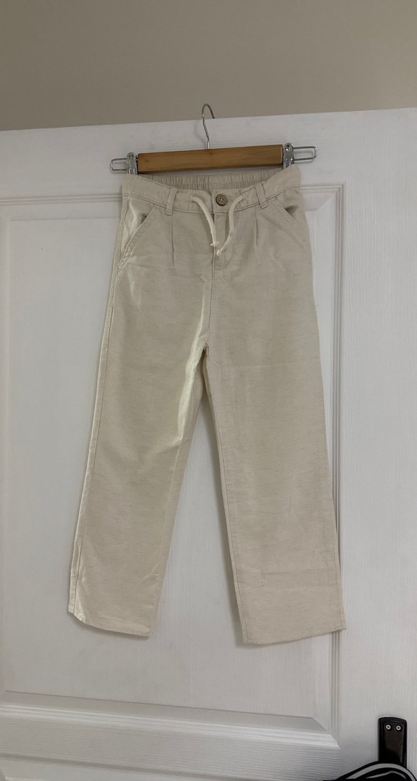 Bej keten erkek çocuk pantolon, rahat kalıp ve zahmetsiz şıklık sunar. Desensiz tasarımıyla trend rahat kombinlere uygundur.