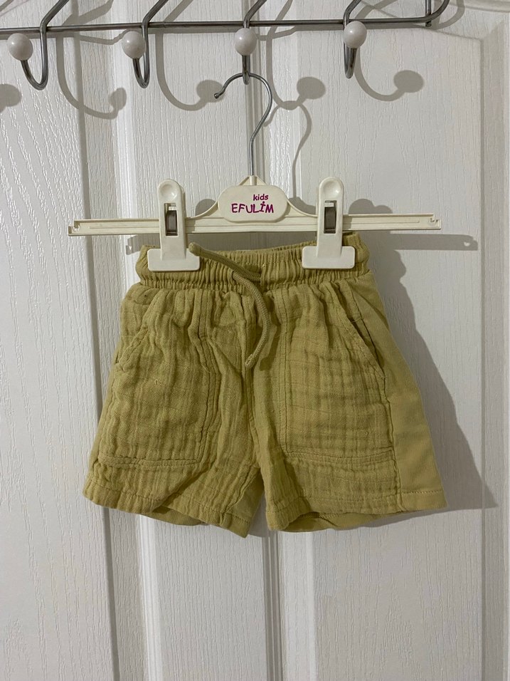 Bohem tarzda, keten kumaştan yapılmış, bej renkli ve pile detaylı erkek çocuk şortu. Rahat ve bol kesim, sade ve açık renk tasarım.