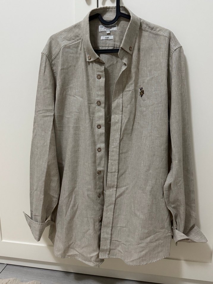 Yumuşak keten kumaştan yapılmış, düğmeli ve uzun kollu bej erkek gömleği. Çentikli yaka ve regular fit, günlük sokak stili için uygun.