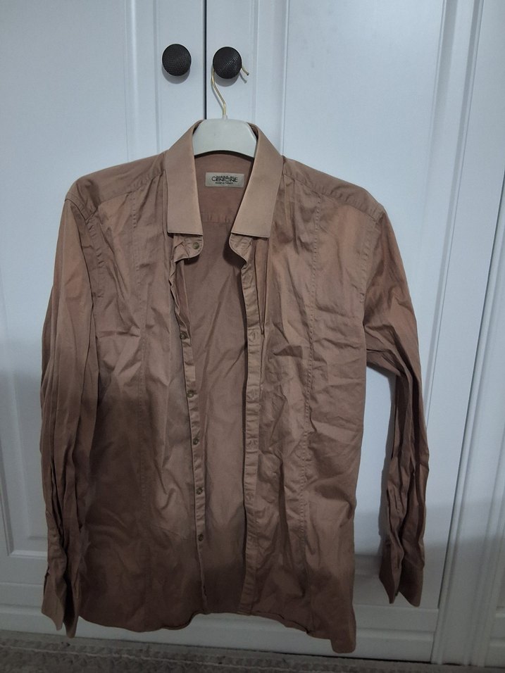 Bej keten kumaştan, düğmeli ve uzun kollu, normal boyda rahat kesim erkek gömlek. Minimalist ve normcore tarzda, ofis için uygun.