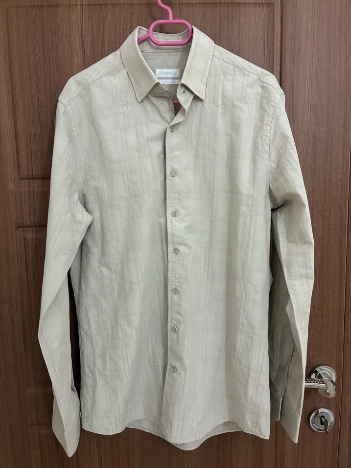 39 beden Bej keten erkek gömlek, uzun kollu ve düğmeli. Notched lapel yakaya sahip, rahat kesim ve normal boyda, günlük ve ofis kullanımı için uygundur.
