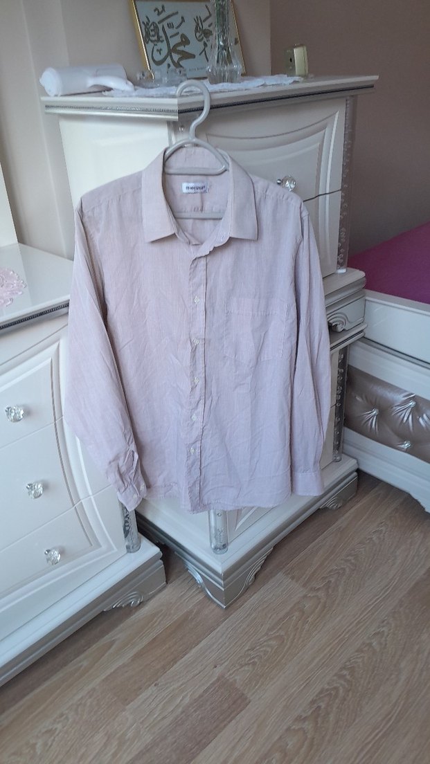 Bej keten erkek gömlek, uzun kollu ve düğmeli. Yakalı ve bol kesim, günlük kullanım için uygun.