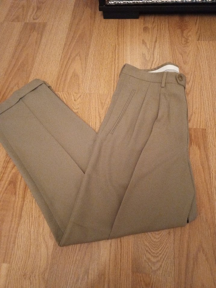 Bej renkte, pileli ve normal kesim erkek kumaş pantolon. Minimalist tarzda, ofis kullanımı için uygun.