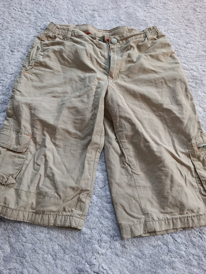 Bej renkli keten kumaştan, bel kemerli, rahat kesim erkek midi şort. Sokak stili ve açık hava kullanımı için uygun.