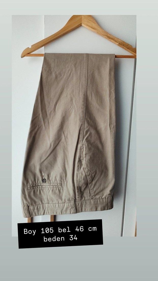 Bej keten erkek pantolon, regular fit ve midi boy. Desensiz, günlük kullanım için uygun. Beden 34, boy 105 cm, bel 46 cm.