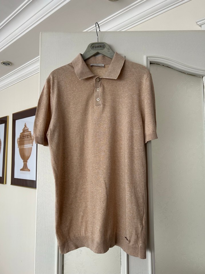 Bej renkli erkek polo tişört, kısa kollu ve yakalıdır. Nefes alabilen keten kumaştan, düğmeli ve midi boyda, rahat kesimlidir.