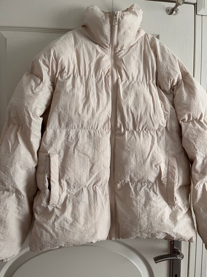 Bej keten kumaştan, uzun kollu, yüksek yakalı ve midi boyda erkek mont. Rahat kesimi ve sade tasarımıyla günlük kullanıma uygundur.