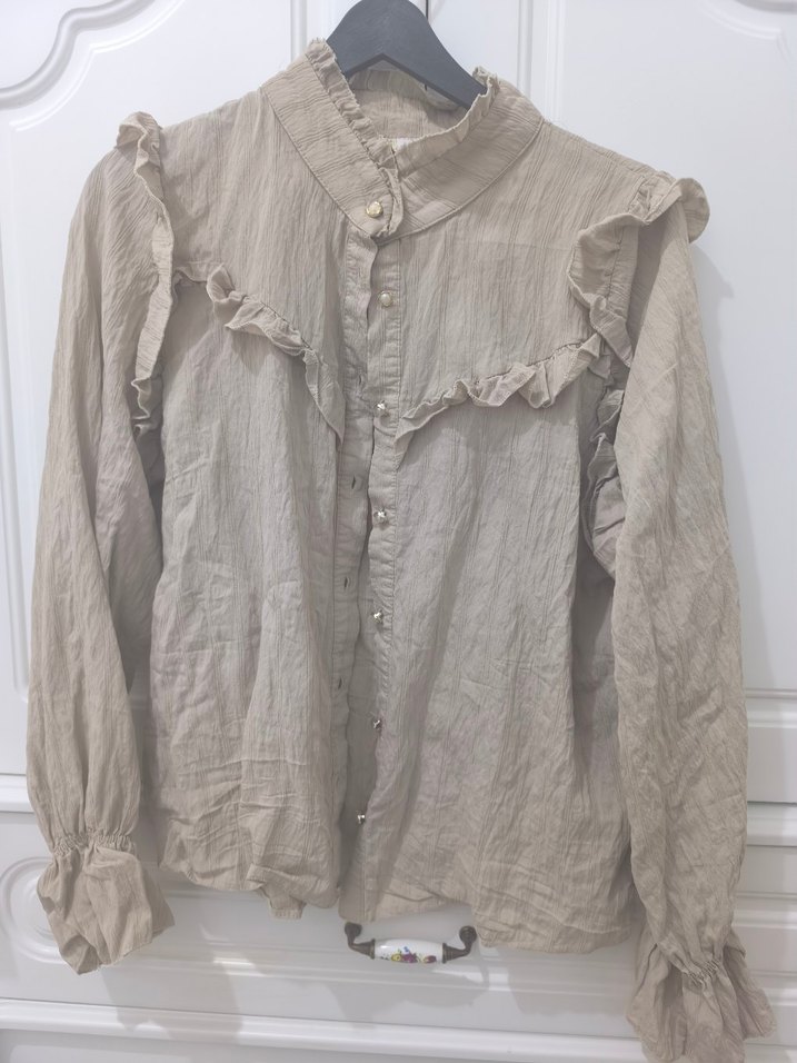 Bej Keten Fırfırlı Kadın Gömlek