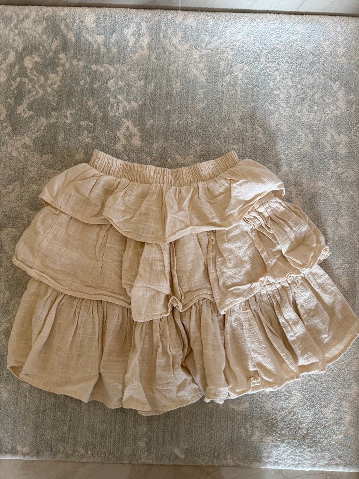 Bej renkte, keten kumaştan, bol kesim ve kat kat fırfırlı mini etek. Bohem Paris tarzını yansıtır, günlük kullanıma uygundur. 1 kere giyildi.