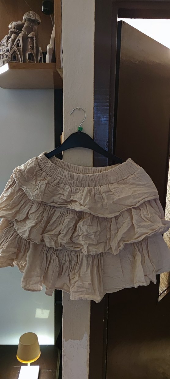 Bej renkte, keten kumaştan, bol kesim ve kat kat fırfırlı mini etek. Bohem ve Paris tarzını yansıtır, günlük kullanım için uygundur.