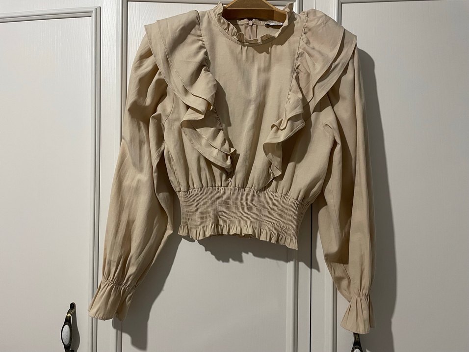 Bej keten kumaştan, fırfır detaylı, uzun kollu ve yüksek yakalı bluz. Bol kesim ve lastikli bel ile rahat ve şık görünüm sağlar.