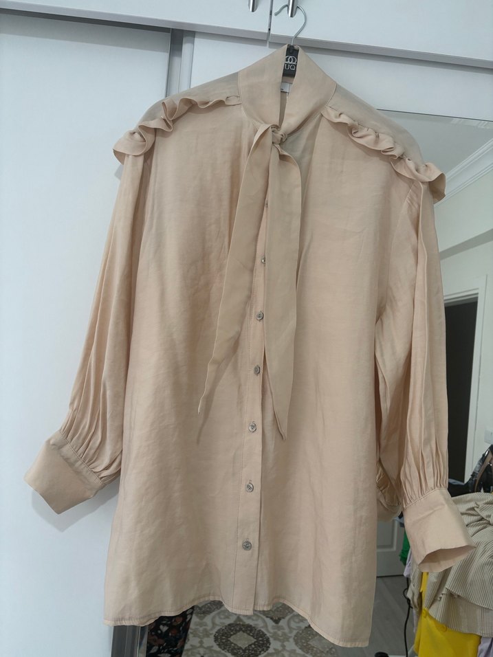 Bej keten gömlek, fırfır detaylı ve yakalıdır. Uzun kollu, manşetli ve bol kesim midi uzunluğundadır. Bohem tarzda, günlük kullanıma uygundur.