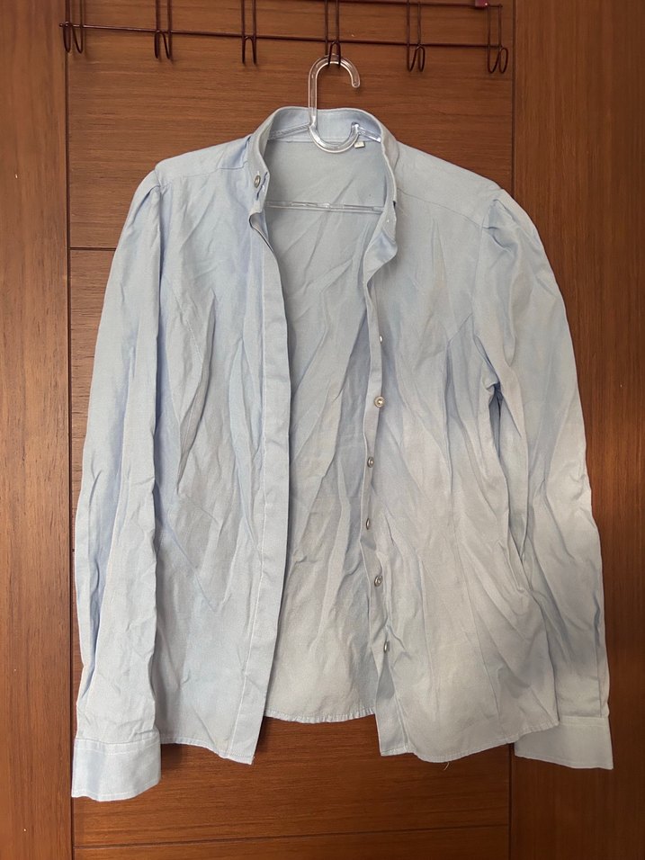 Bej keten gömlek, yakalı ve düğmeli. Uzun kollu ve normal kalıpta, gündelik rahat kullanım için uygundur.