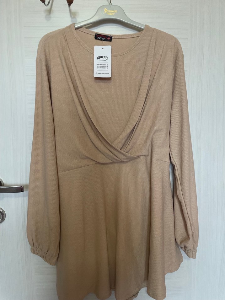 Bej keten hamile bluzu, uzun kollu ve drapeli V yaka tasarıma sahiptir. Salaş kesim ve normal midi boydadır, günlük rahat kullanıma uygundur.