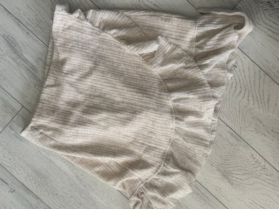 Yumuşak keten kumaştan yapılmış bej hamile midi etek, bol kesim ve fırfır detaylarına sahip. Düz, desensiz, bohem tarzda ve günlük kullanıma uygun.