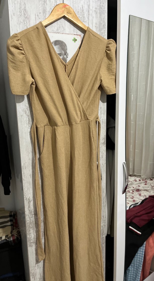 Bej keten hamile tulumu, drapeli ve bol kesimdir. V yakalı, kısa kollu ve uzun boylu olup günlük kullanıma uygundur.