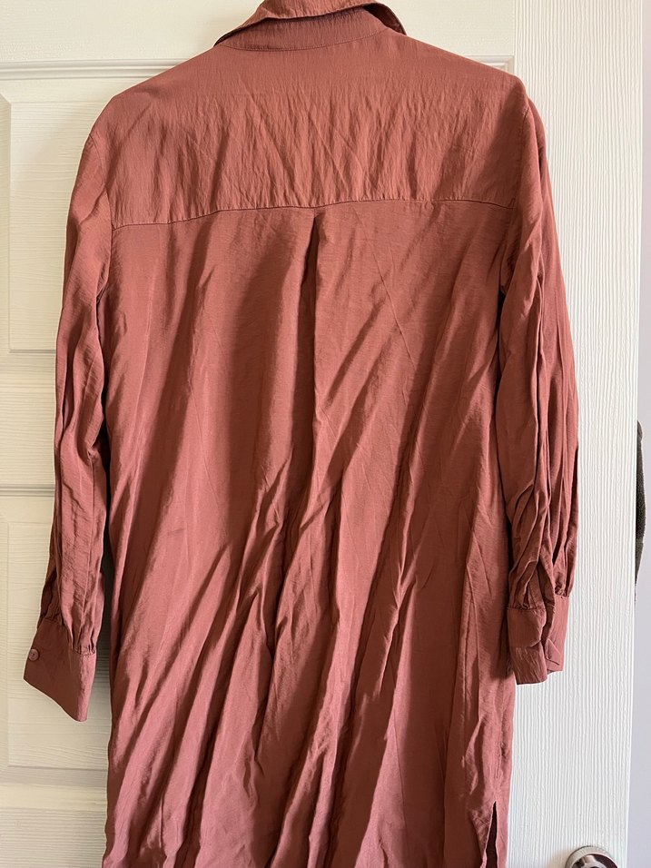 Keten kumaştan, bol kesim ve drapeli hamile tunik. Bej parlak renkte, yakalı, uzun kollu ve midi boydadır. Günlük kullanıma uygun, minimalist bohem tarzda.