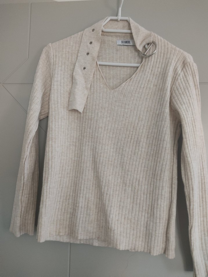Bej renkli kazak, uzun kollu ve robalı tekne yaka detayına sahiptir. boyun detayı mevcut
