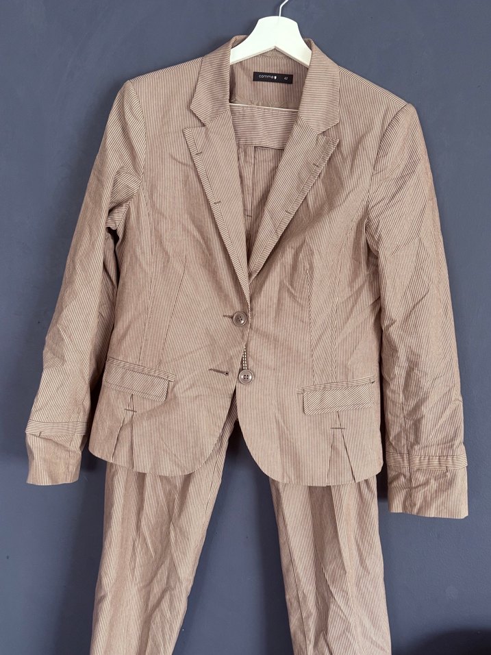 Bej keten kumaştan, yakalı ve düğmeli, uzun kollu kadın blazer ceket. Normal kalıp ve ofis kullanımı için uygun.