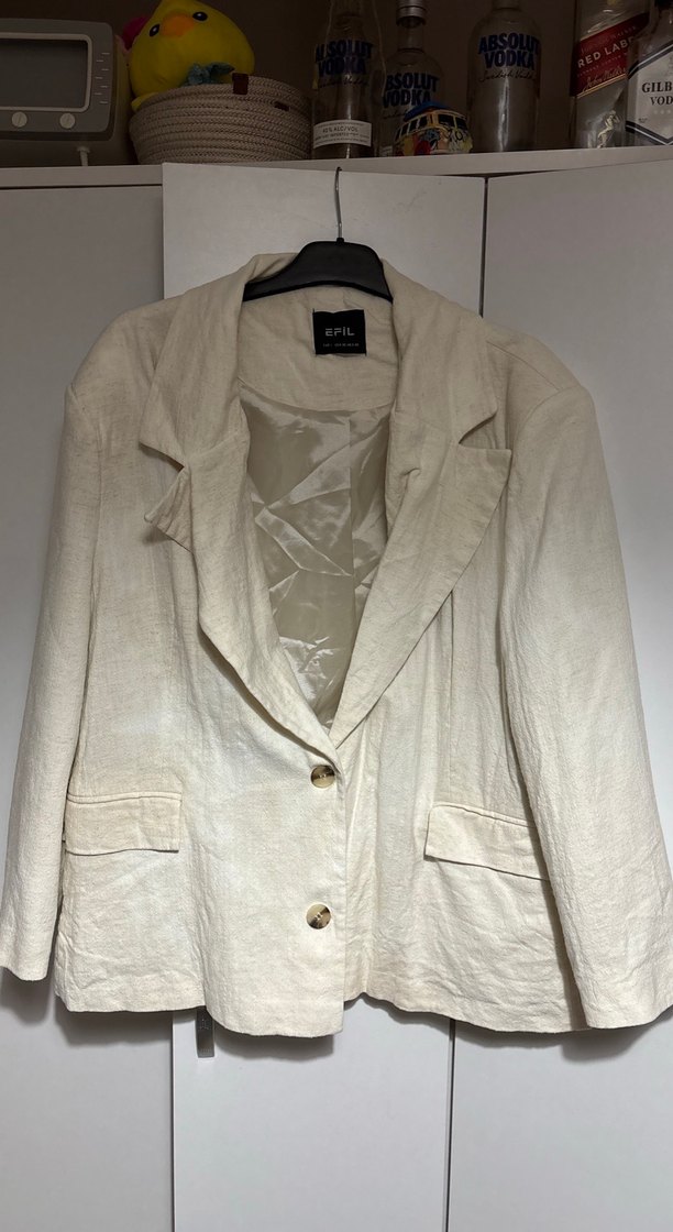 Bej keten kadın blazer ceket, kesik yakalı, düğmeli ve uzun kolludur. Normal midi boyda, rahat kesim ve parlak görünüme sahiptir. ✨