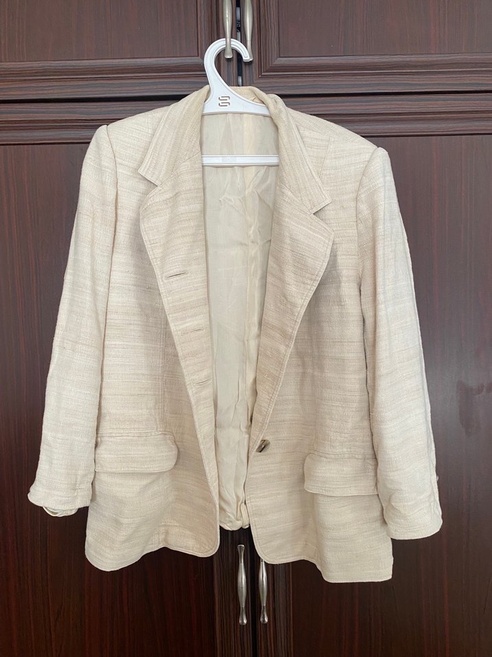 Bej keten kumaştan, klasik kesim, düğmeli kadın blazer ceket. Uzun kollu ve normal midi boyda, ofis stiline uygundur. Düz ve sade tasarıma sahiptir.