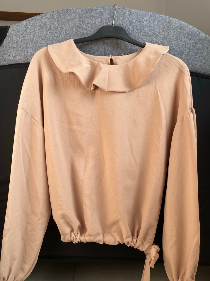 Bej renk keten kumaştan, uzun kollu, salaş kesim kadin bluz. Yaka tipi kayık, drapeli ve normal midi boyda, günlük kullanıma uygundur.