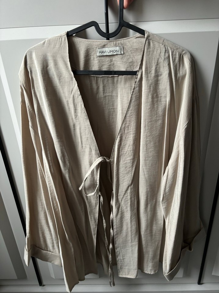Mavi limon markası.Bej keten kumaştan, uzun kollu ve notched lapel yakalı bol kesim kadın bluz. Önde bağlama detayıyla rahat bir görünüm sağlar. Günlük kullanım için uygundur.