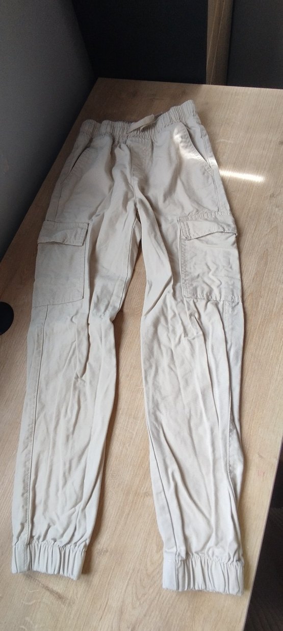 Bej keten kumaştan, bol kesim ve lastikli bel detaylı erkek çocuk pantolon. Rahat sokak stili için yan ceplerle tasarlanmıştır.