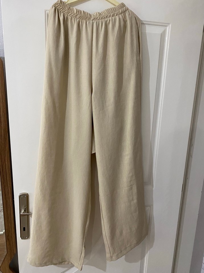 Bej renkte, keten kumaştan yapılmış, bol kesim ve uzun paçalı kadın pantolonu. Minimalist ve rahat normcore tarzıyla günlük kullanıma uygundur. Twıst den alındı sıfır üründür L bedendir