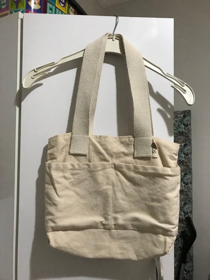 Geniş saplı bej keten kadın çantası, sade ve minimalist tasarıma sahip, günlük kullanım için uygun.