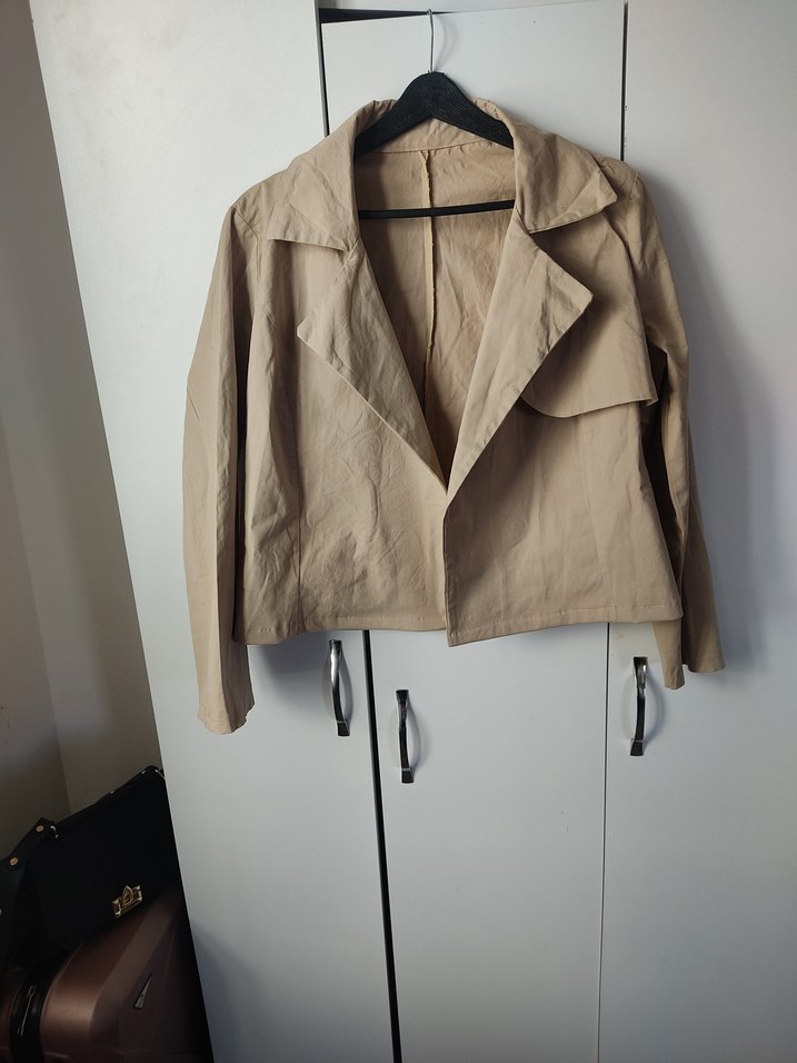 Bej renkli keten kadın ceket, kesik yaka ve uzun kolludur. Rahat kesimi ve midi boyu ile günlük sokak stiline uygundur.