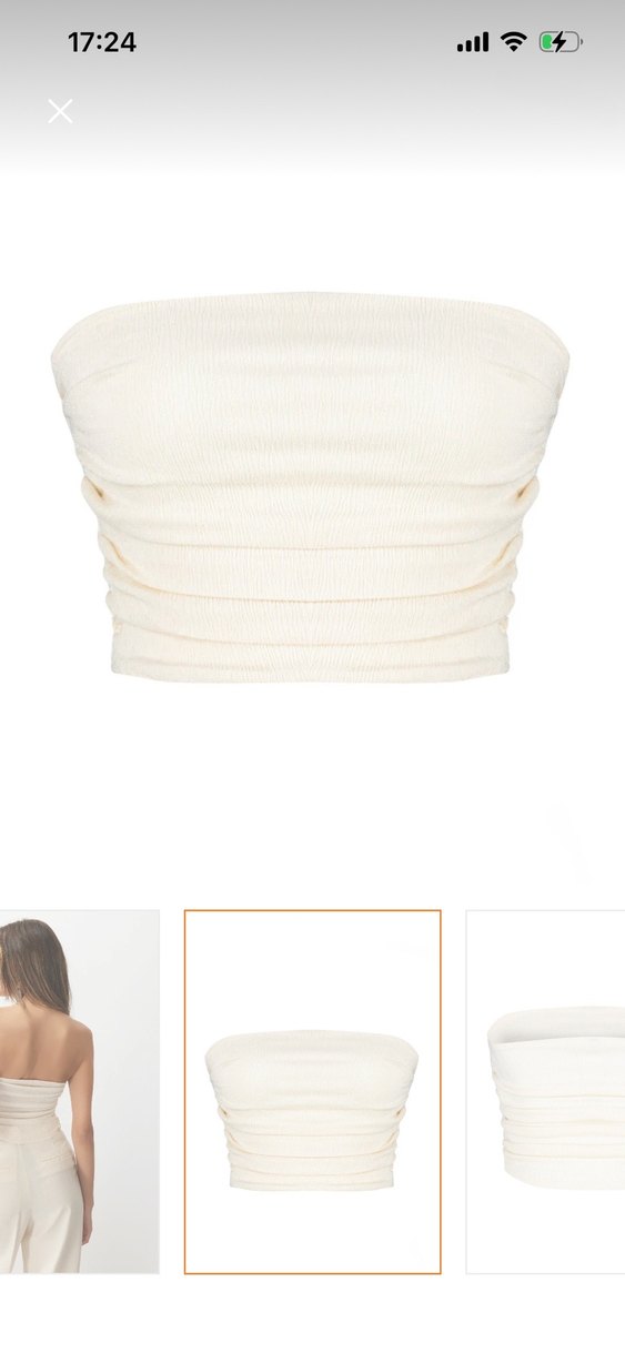 Bej renkte, keten kumaştan yapılmış, kayık yaka ve dar kesime sahip kadın crop top. Askılı kollu ve midi boyda, minimalist sokak stili için uygundur.