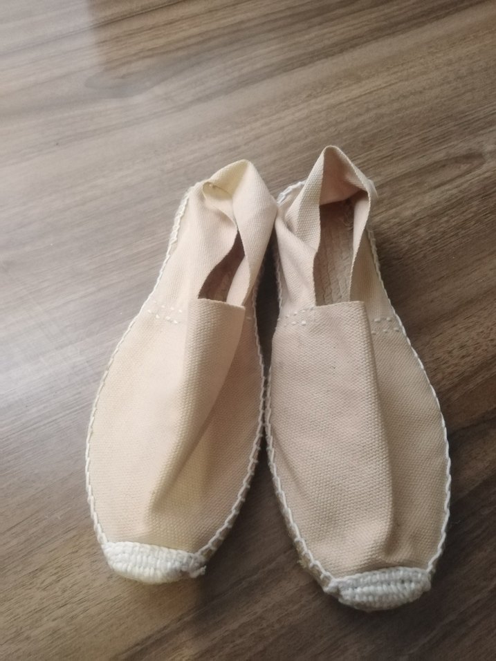 Bej keten kumaştan, dolgu topuklu kadın espadril. Minimalist ve bohem tarzda, desen içermeyen, günlük kullanıma uygun rahat ayakkabı.