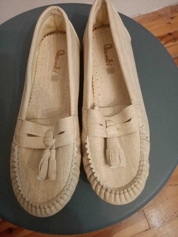 Bej keten kadın babetler, dolgu topuklu, pileli ve püsküllü detaylara sahip. Minimalist ve geleneksel tarzda, günlük kullanım için uygun