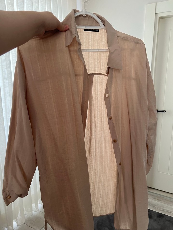 Bej keten kumaştan, düğmeli, uzun kollu, normal midi boyda, bol kesim kadın gömleği. Minimalist ve rahat stil için uygundur.Kenarlarında büzgü yeri var.Tercihe göre öylede giyilebilir.