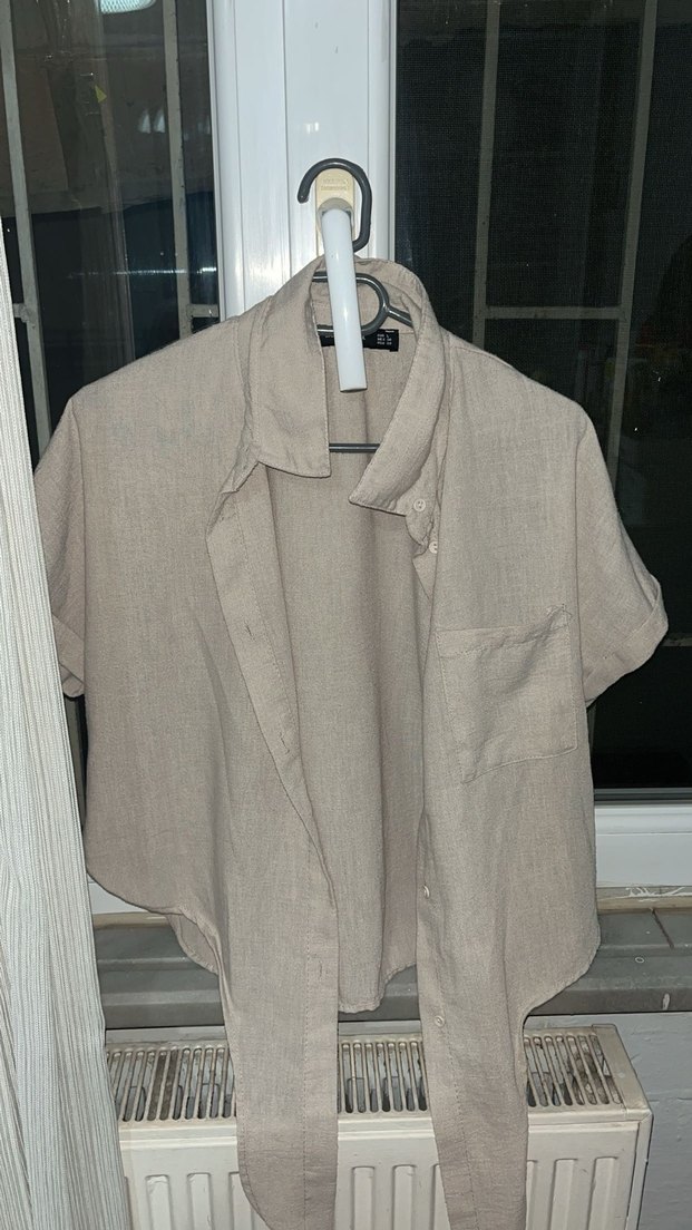 Bej keten kumaştan, kısa kollu, yakalı ve düğmeli, cep detaylı rahat kesim kadın gömlek. Günlük sokak stili için uygundur.
