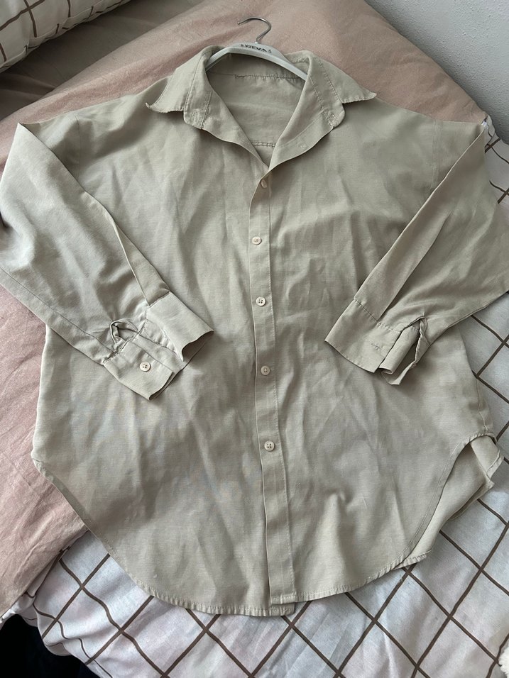Bej keten kumaştan, düğmeli ve yakalı, uzun kollu bol kesim kadın gömleği. Desensiz ve sade, Paris normcore stiline uygun.
