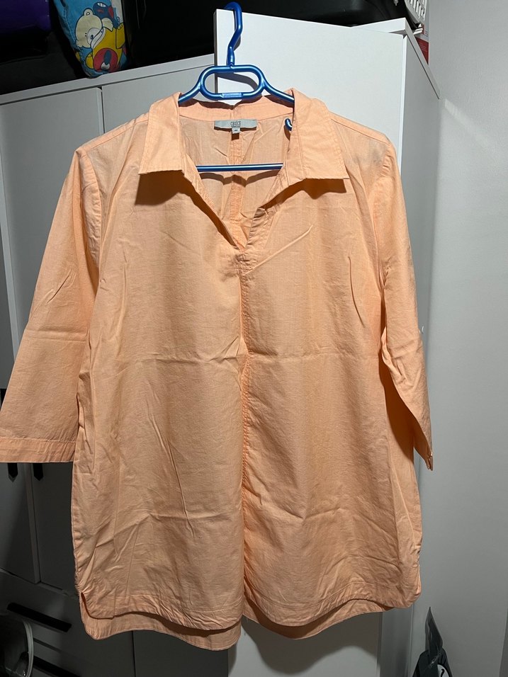 Bej renkli keten kumaştan, kısa kollu, yakalı ve düğmeli bol kesim kadın gömlek. Günlük rahat kullanıma uygundur.