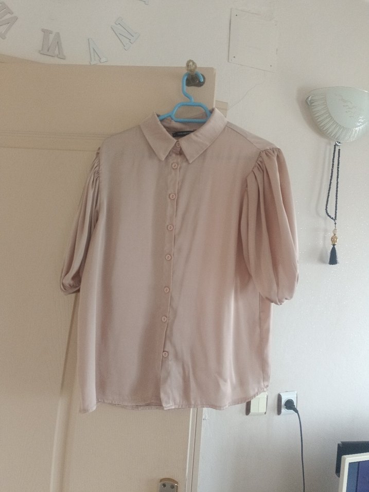 Keten kumaştan, bej renk, düğmeli ve kısa balon kollu, normal boyda salaş kadın gömlek. Günlük kullanıma uygun.