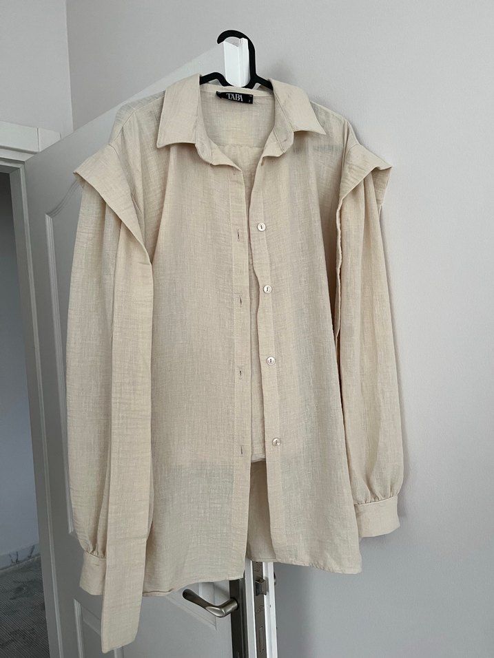 Bej Keten Kadın Gömlek, Düğmeli, Bol Kesim