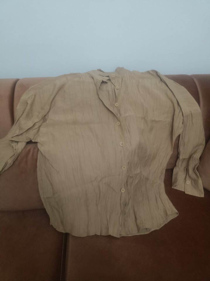 Bej keten kadın gömlek, düğmeli ve salaş kesim. Uzun kollu ve yakalı rahat kullanım için uygundur.