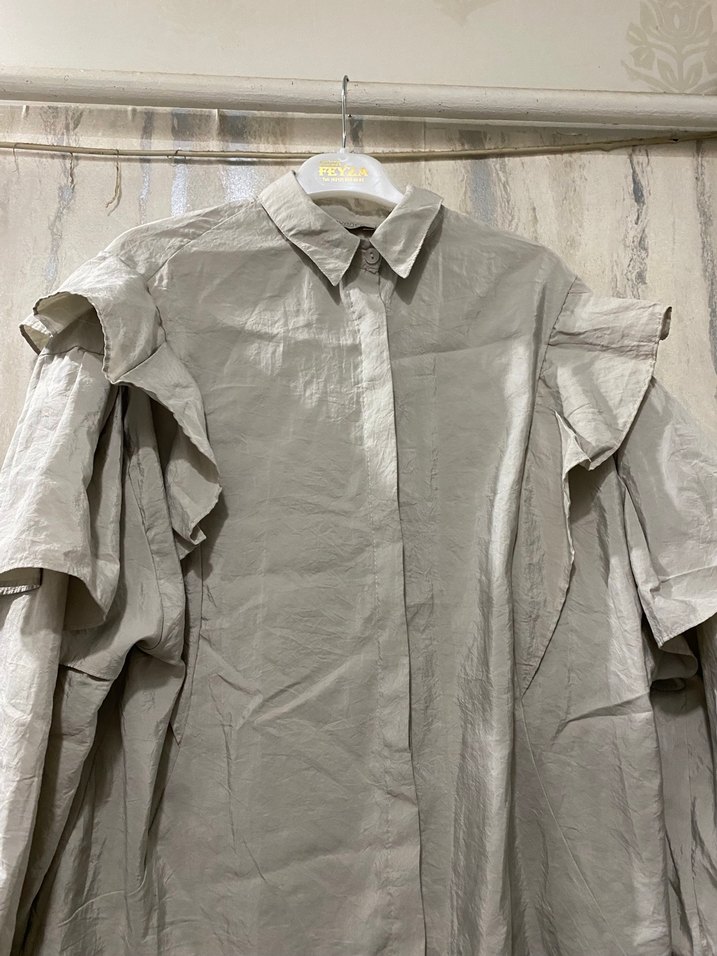 Bej keten kadın gömlek, uzun kollu ve yakalıdır. Kollarında fırfır detayları bulunur. Salaş ve uzun kesimiyle günlük kullanıma uygundur.