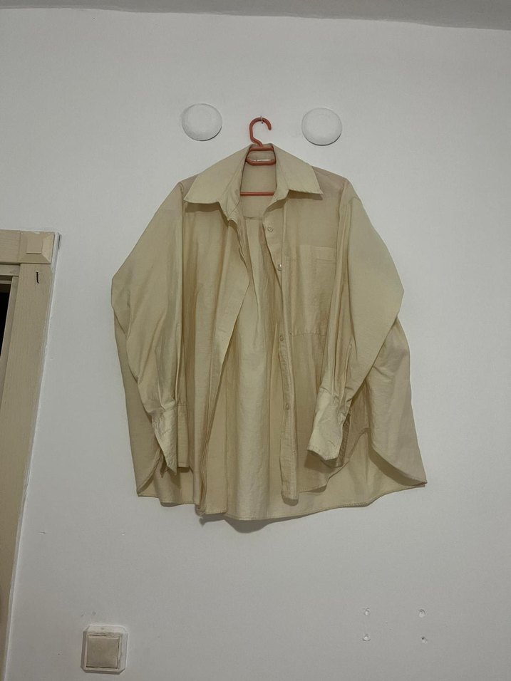 Bej keten kadın gömlek, dökümlü ve bol kesimli. Uzun kollu, yakalı ve normal midi boydadır. Minimalist günlük stil için uygundur.