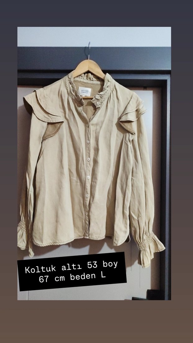 Bej TENSEL KUMAS , uzun kollu, bol kesim kadın gömlek. Fırfır detaylı, yakalı ve günlük bohem tarzda. 67 cm boy, 53 cm koltuk altı, beden L.