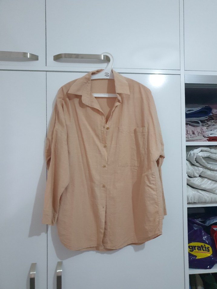 Bej keten kumaştan, uzun kollu, salaş kesim kadın gömlek. Normal midi boyunda, minimal ve desensiz tasarımıyla günlük kullanıma uygun.
