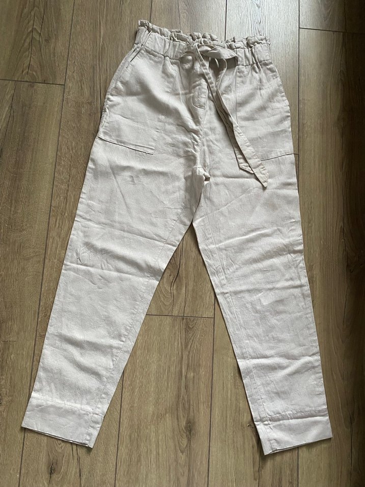 Bej renkli, keten kumaştan yapılmış, kemerli ve bol kesim kadın pantolonu. Günlük kullanım ve sokak stili için uygundur, midi boy ve desensizdir.