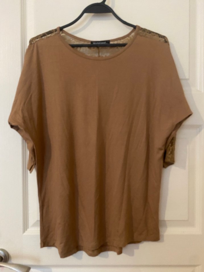 Kısa kollu, yuvarlak yakalı, bej keten kumaştan, rahat kesim günlük kullanıma uygun kadın bluz.